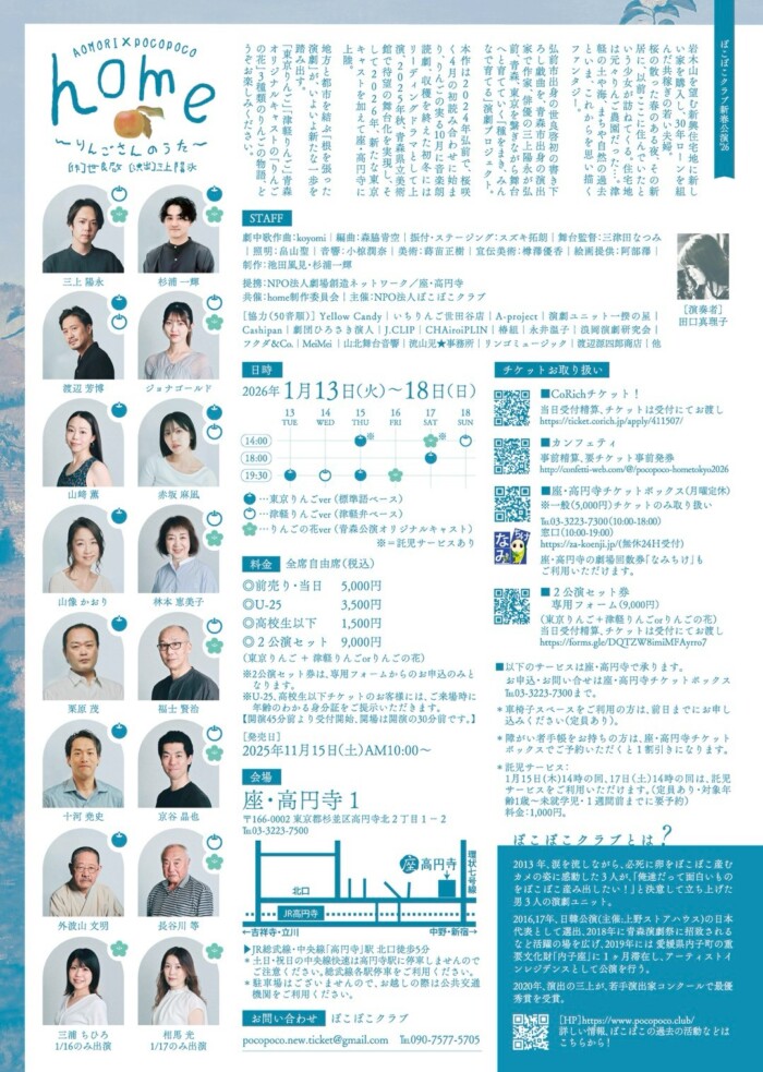 来年2026年最初の舞台は、座・高円寺さんにて「home〜りんごさんのうた〜」です!こちらは青森にてリーディングやコンサート等、様々な上演スタイル、脚本ブラッシュアップを重ね、1年7ヶ月ほどかけて温め続けてきた作品です。今年11月に初めて舞台化し、青森公演を終え、いよいよ東京公演にてフィナーレを迎えます。